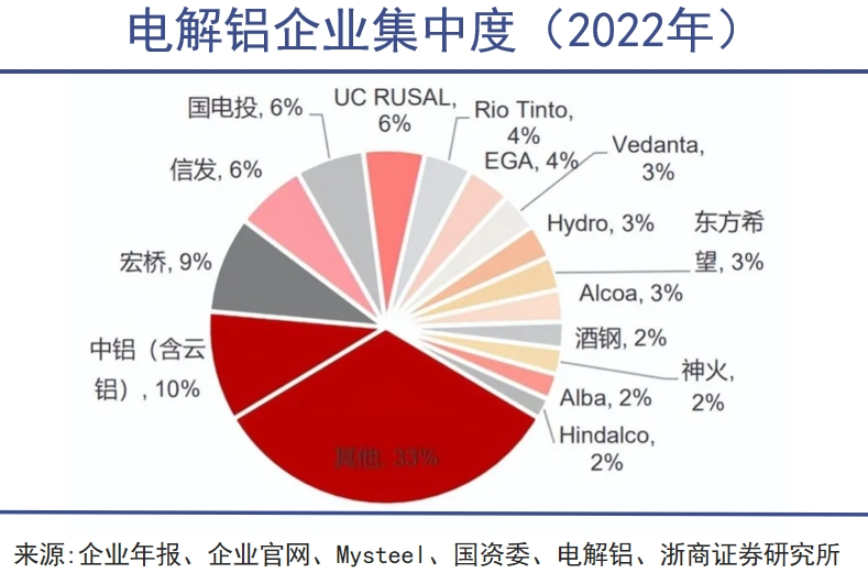 目前,全球前十五大电解铝生产企业,中国独占七个席位,分别是中铝、宏桥、信发、国电投、东方希望、酒钢和神火,产量占全球总量的37%。