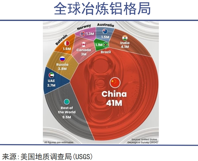 根据美国地质调查局(USGS)的统计,2023年中国冶炼铝产量是第二名印度的十倍,全球其他国家加起来的总和也只有中国的70%。