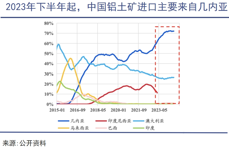 另一个核心国家是印尼,2023年6月,印尼起发布铝土矿出口禁令政策,要求本土资源与本土氧化铝产能绑定,将项目落地国内,创造更多就业和国家收入,因此,我国铝企纷纷直接在印尼设厂,获得本土低价铝土矿带来的成本红利。